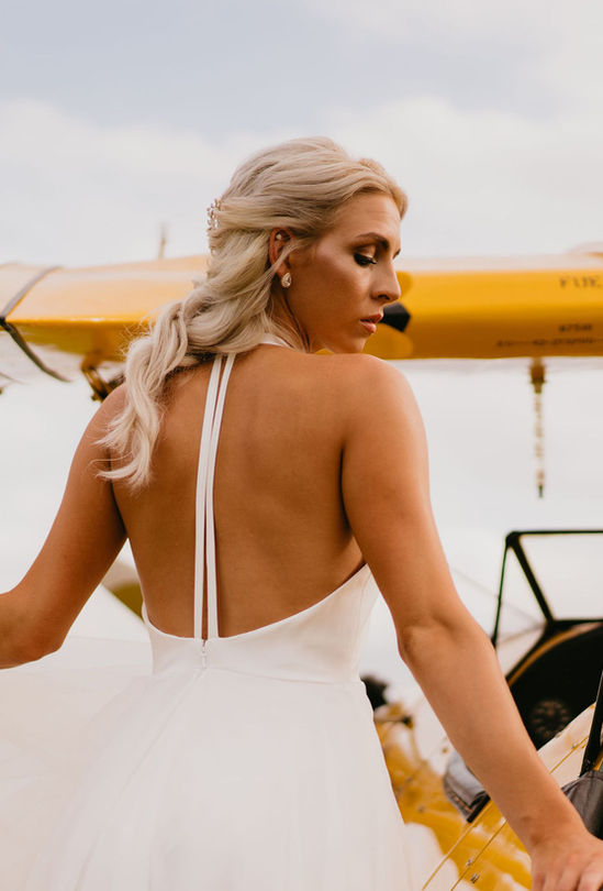 Timeless all white haltered, A-line gown. Full tulle skirt with a front slit and open back with two parallel straps along the center back.